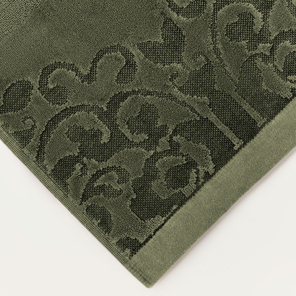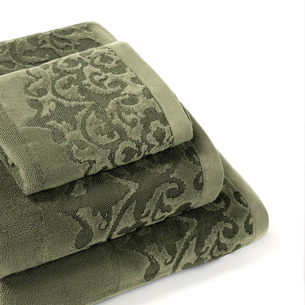 Jacquard towels are yarn-dyed terry towels woven on a special hook with an attachment allowing patterns to be woven into the terry pile. Jacquard weaves also have different heights of terry loop and intricate color designs. A jacquard design will appear on both the back and face of the towel.