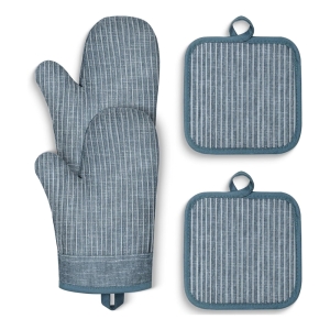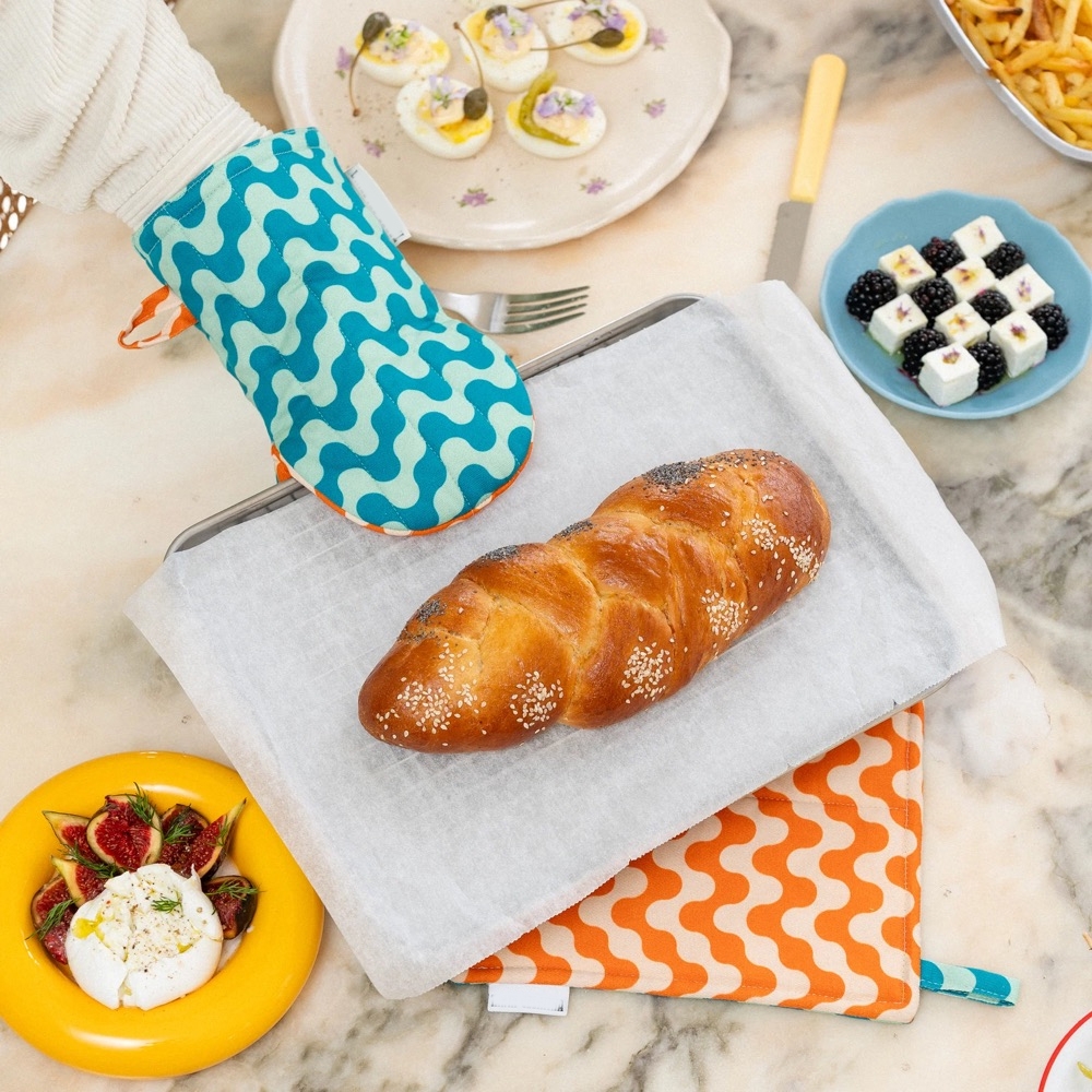 These orange and green quilted oven mitt and pot holder are the most stylish way to protect your hands (and your table) from hot stuff.
